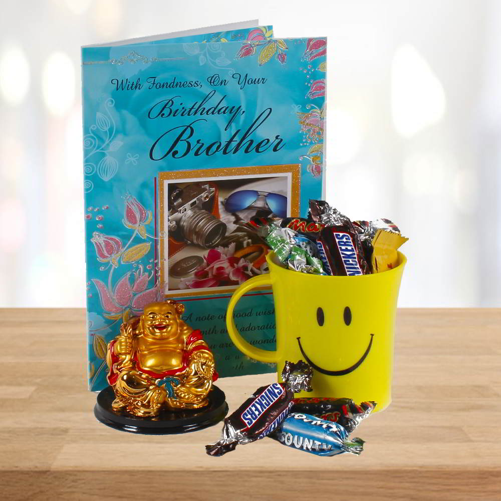 Product Consists : Laughing Buddha Imported Assorted Miniature Chocolates in a Smiley Mug (Weight: 100 Gms) along with a Birthday Greeting Card for Bro.