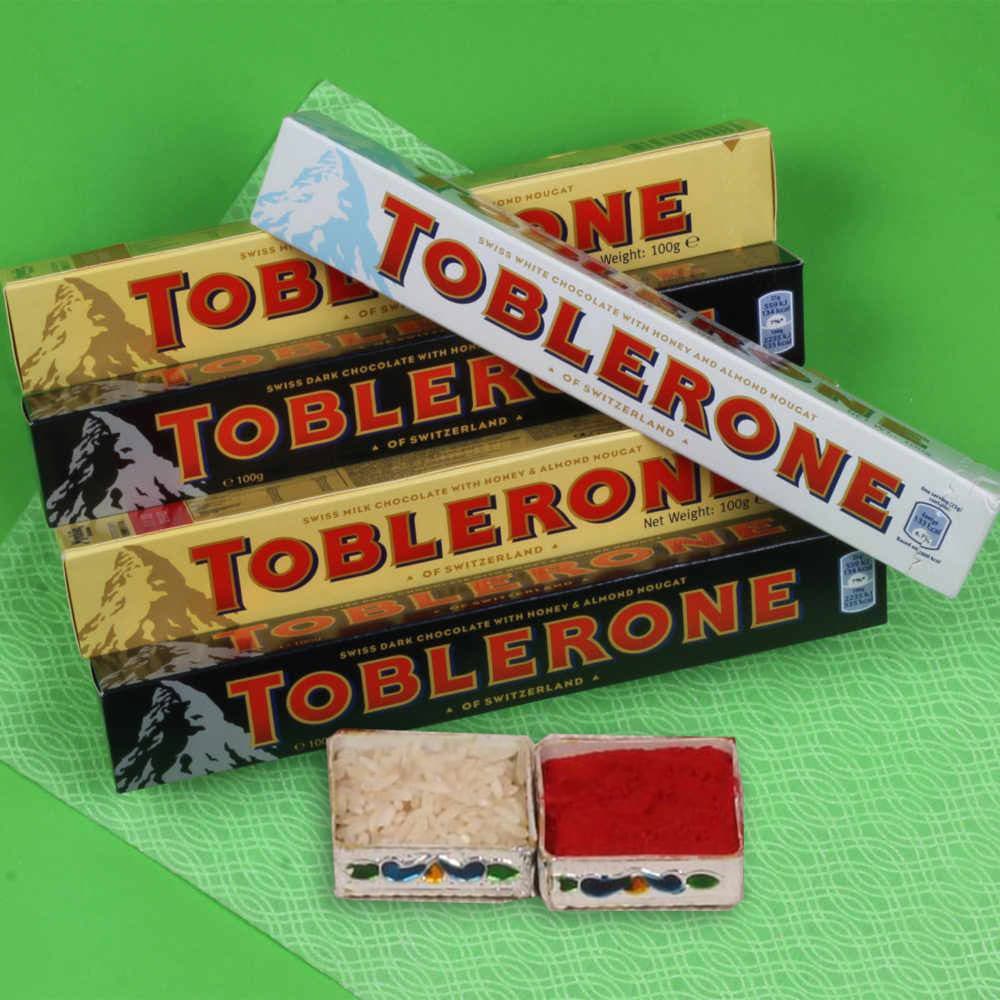 Indulge in the ultimate luxury with our Bhaidooj Combo Toblerone Five Chocolates. Each bar (100g) of rich, velvety Toblerone comes in your choice of flavor, paired with a pack of Kumkum Chawal for a traditional touch. Elevate your celebrations with this sophisticated and exclusive treat.