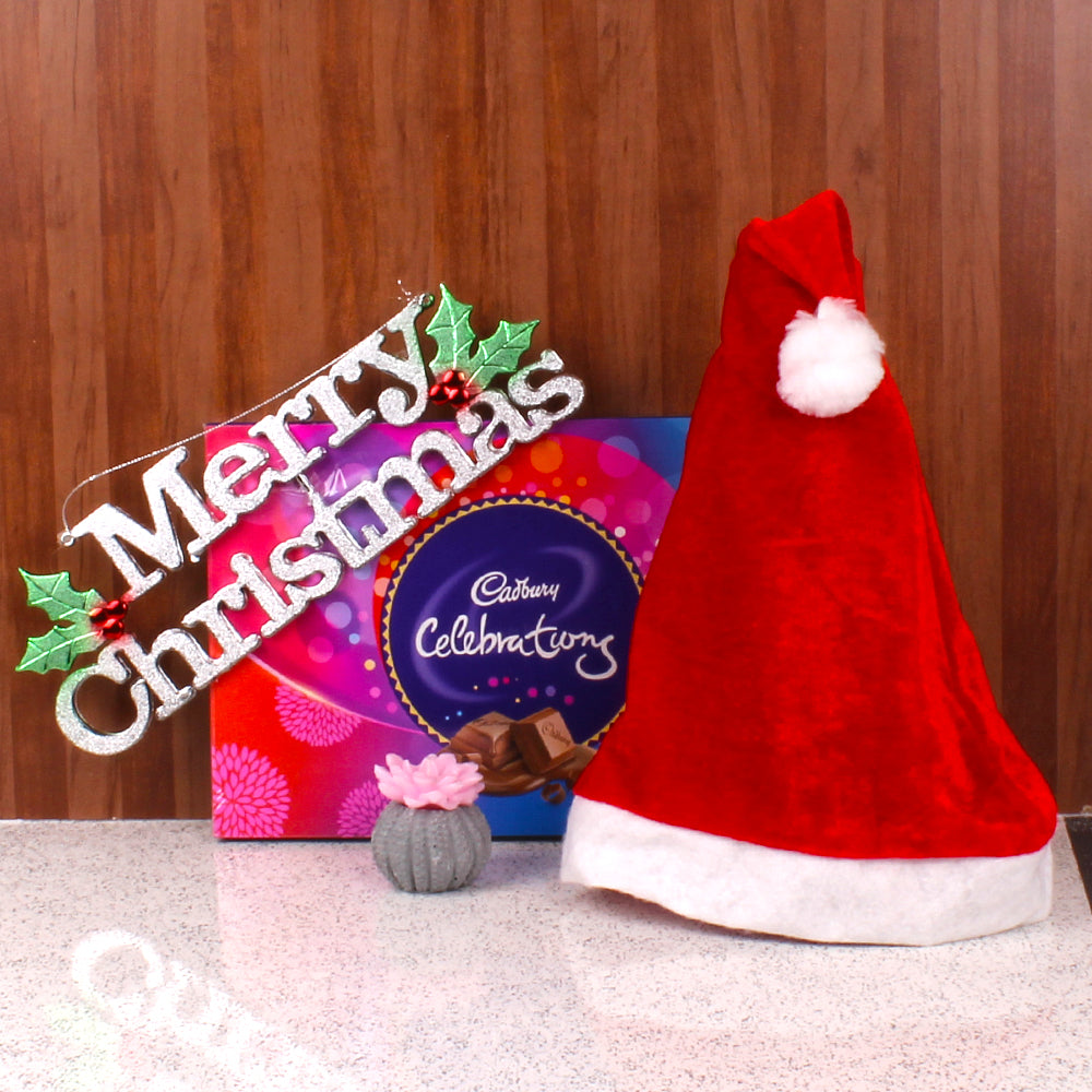 Product Consist : Merry Christmas Banner along with Floral Candle and Cadbury Celebration Chocolates Box (Weight: 131 Gms) with Santa Red and White Cap.
