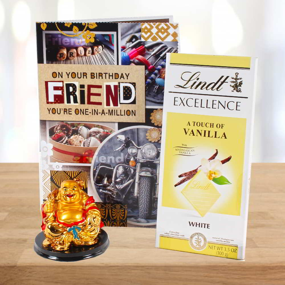 Product Consists : Laughing Buddha and Friend Birthday Greeting Card along with Lindt Excellence White Chocolate with a Touch of Vanilla (Weight: 100 Gms).