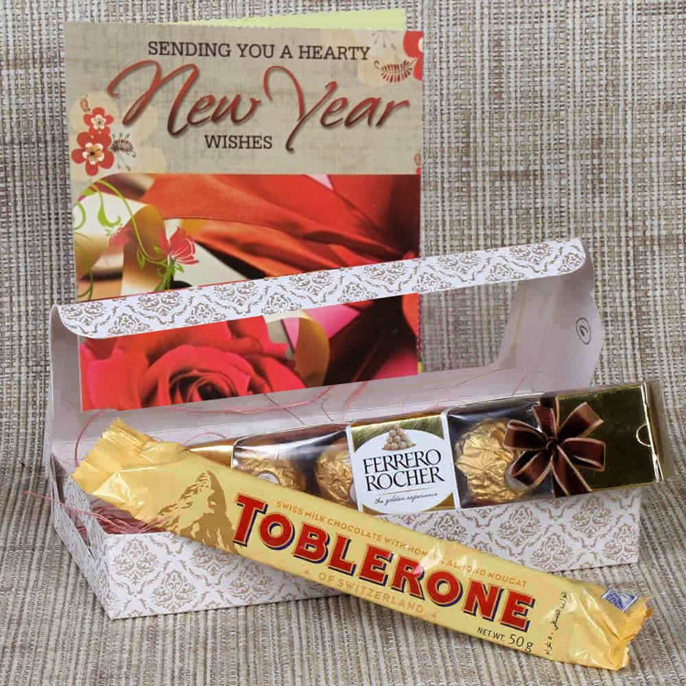 Product Details: 4 pcs of Ferrero Rocher Chocolate, 1 Bar of Toblerone Chocolate (Weight: 50 Gms) in a Gift Box New Year Greeting Card. (Please note - Colour and Designs of Gift Box may vary).