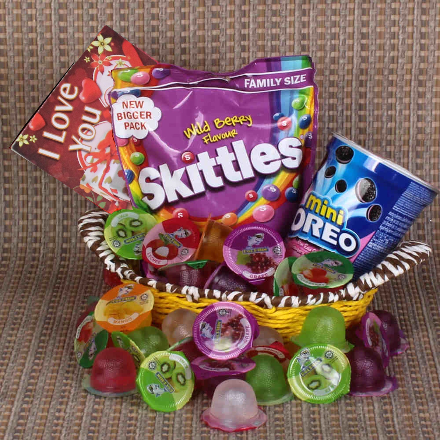 Valentines Gift Basket of Skittles and Mini Oreo with Fruit Jelly